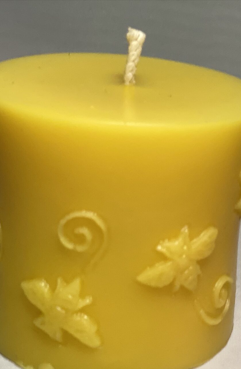 This 2 1/2″ tall by 2 1/2″ diameter pillar candle has lovely swirls and bees decorating it.